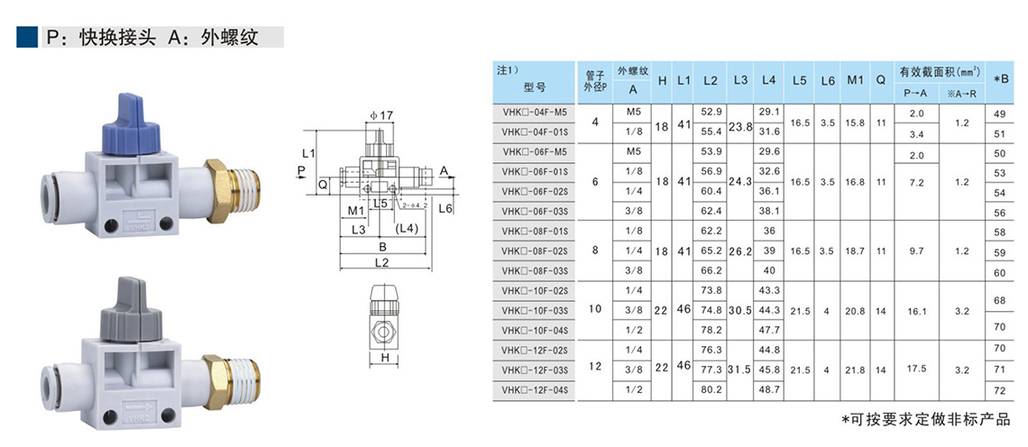 2銅/3銅手動閥VHK系列 P:快速接頭 A:外螺紋