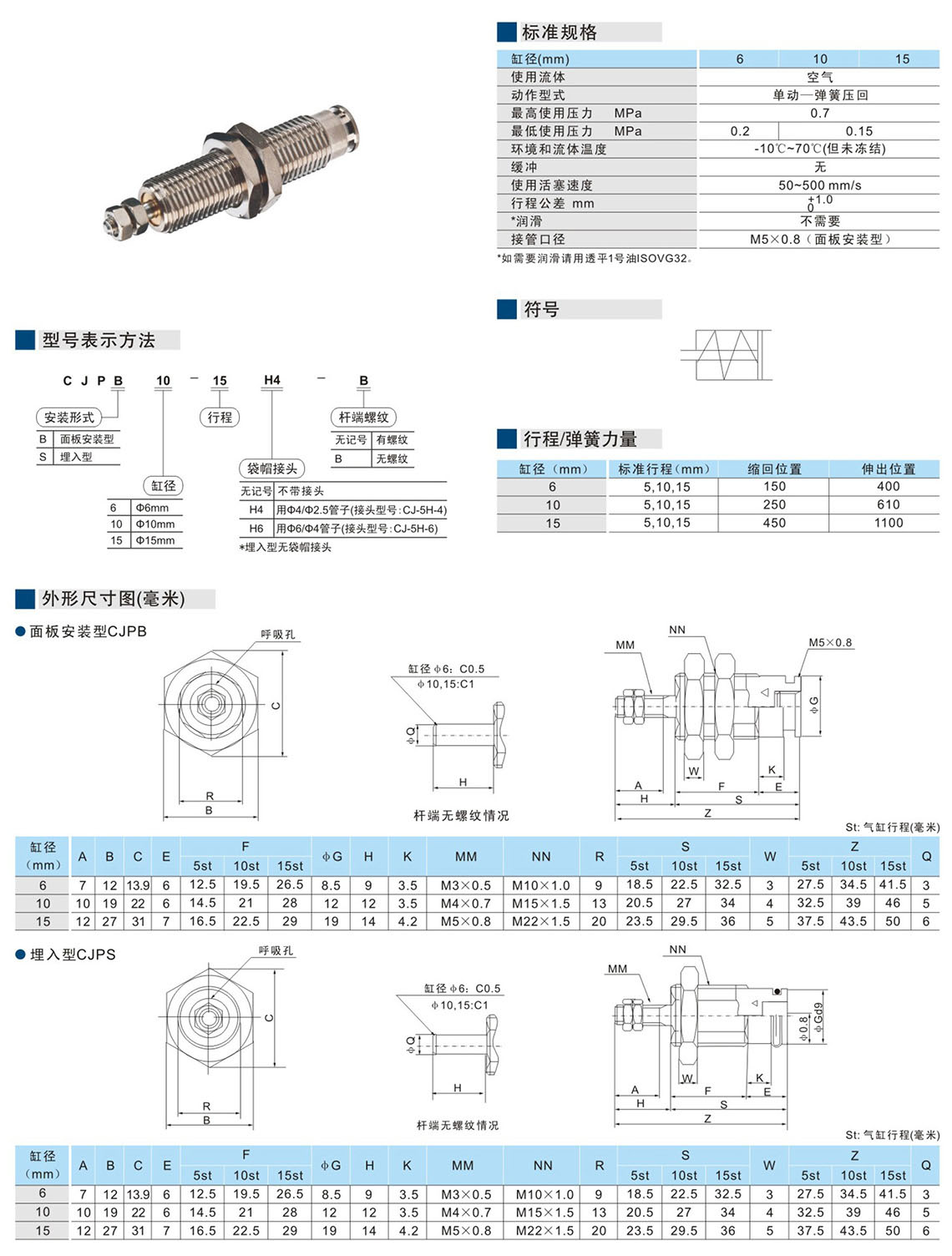 針型氣缸(單作用)CJP系列(Φ6-Φ15)